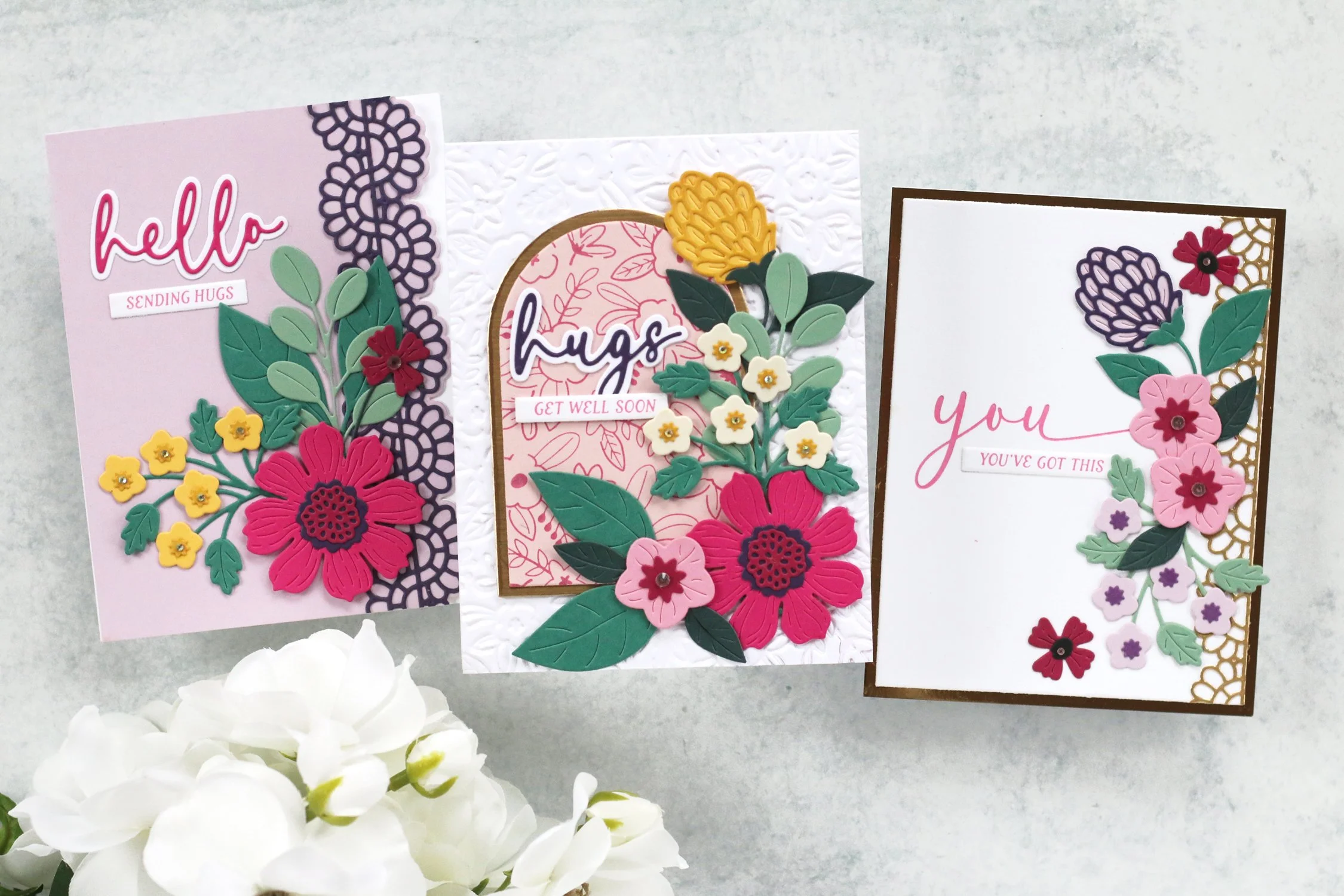 The florals in the Vivid Expressions collection are just beautiful, and a great staple floral die set to have on hand. But I didn’t stop with just one card! After the live, I had enough die cuts on hand to create two more cards using the collection.