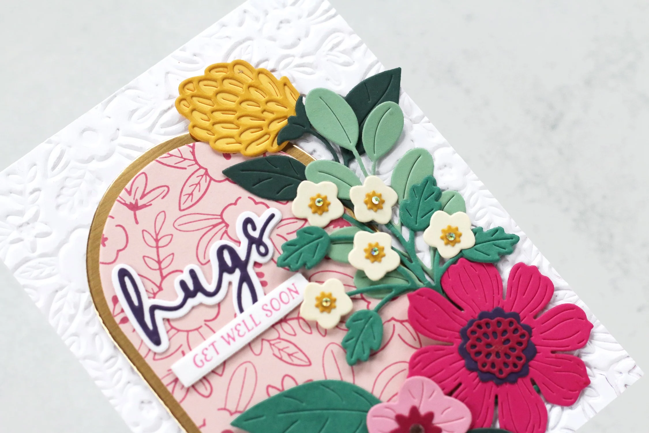 I combined a few of my favorites from the BOGO sale like the Essentials Arches dies, Floral Celebration press plate, which I used on my BetterPress and to emboss paper, and gold Treasured Cardstock with the Vivid Expressions collection to create. I love combining old and new to create something fabulous!