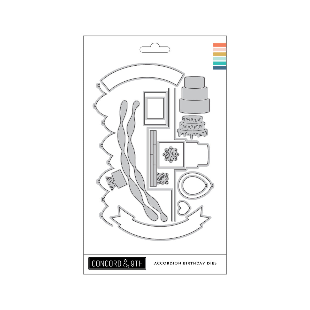 For my first card, I used the Accordion Card Base Dies to create a base for the festive Accordion Birthday Dies. I created three layers of balloons, presents, and a cake, plus added streamers zig-zagging across the window.