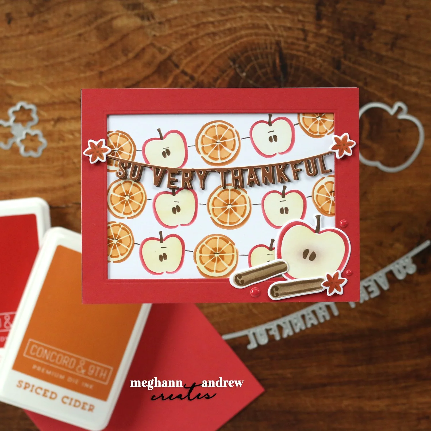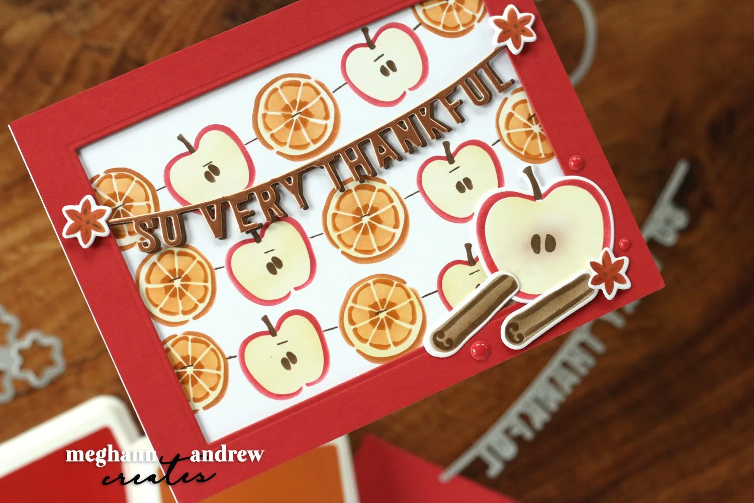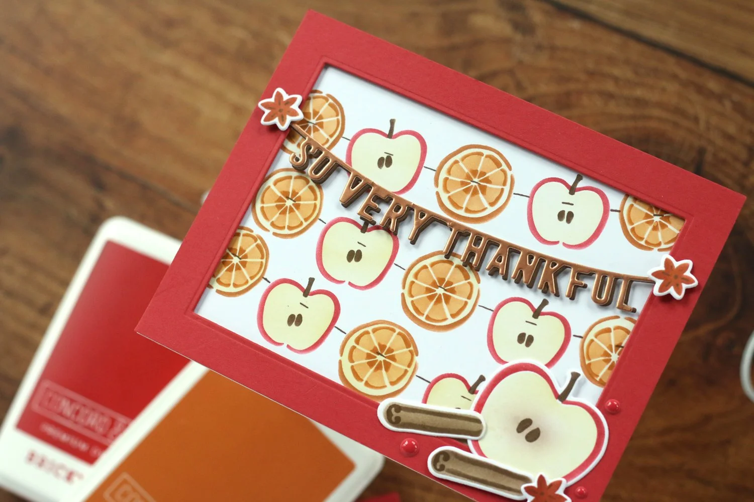 With the frame popped up, I thought it would be important to add some elements to the foreground, and the ‘so very thankful’ banner was perfect! I die cut it from Rose Gold foiled cardstock and Nutmeg, offsetting the die cuts to create a shadow. I also blended another apple, cinnamon sticks, and star anise to sit on the Brickyard frame of the card.