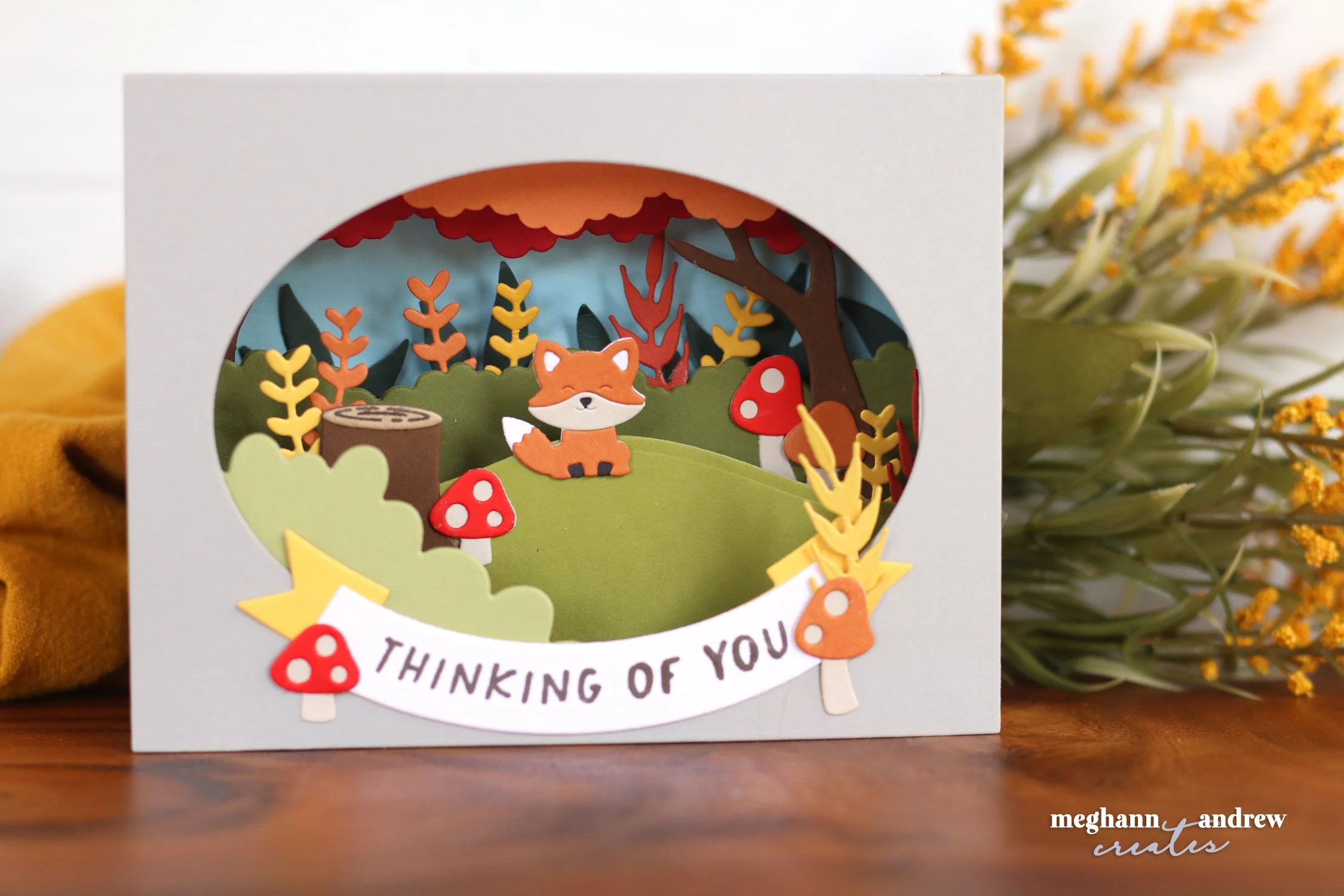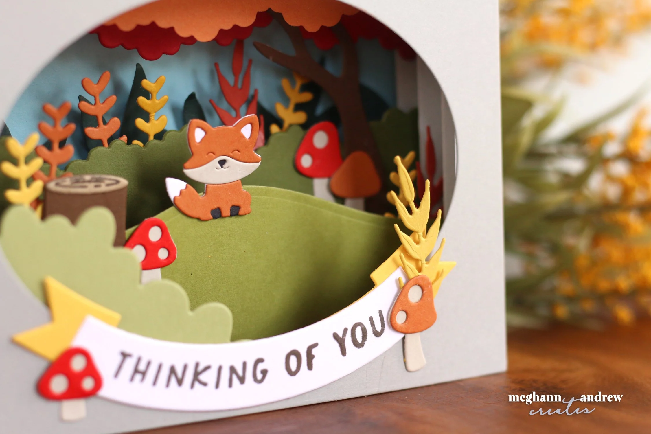 Anything goes inside once you put the accordion card together. I created four layers of foliage with a tree stump, mushrooms, and autumnal plants and trees, setting the scene. The sweet little fox was placed right in the center. To highlight the scene and the beautiful oval opening, I added the ‘thinking of you’ sentiment banner, using the Accordion Woodland Stamp Set, which I adorned with mushrooms & foliage to finish off the card.