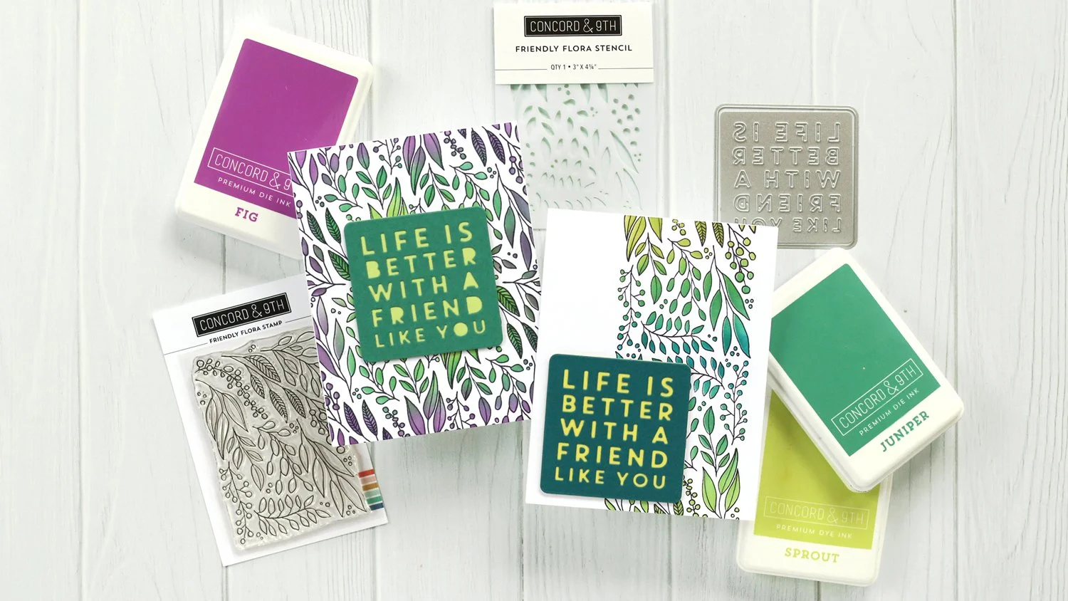 The Friendly Flora bundle is especially unique! This one includes a 3 x 4” stamp filled with a beautiful, delicate flora detail, a coordinating stencil to color it in, plus a sentiment square die. I loved using this bundle both to fill a card front and add a simple strip of flora down my card fronts. Don’t miss the easy way I show you to cover your card front with this stamp in the video above, too!