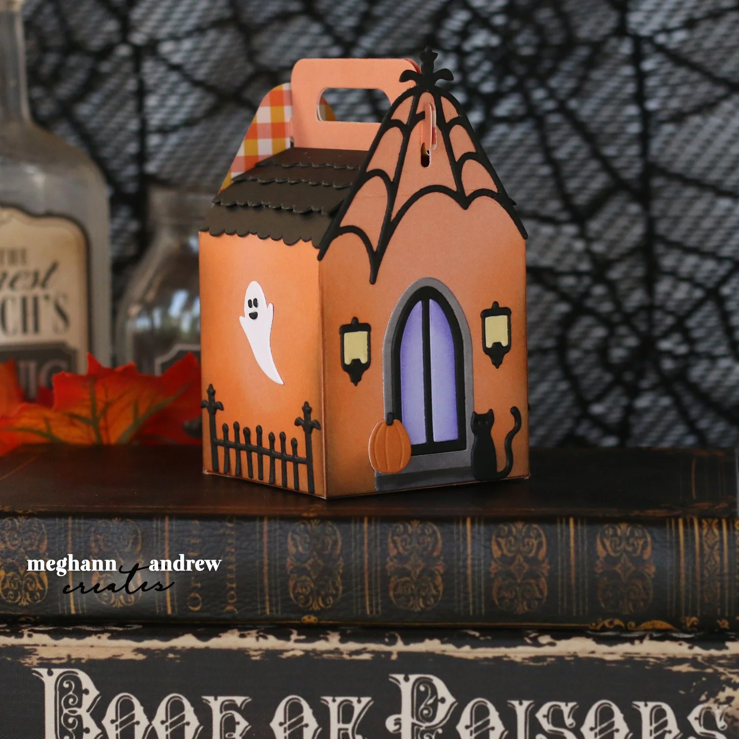 This entire box was created with just three die sets—the House Treat Box Decorative Die Set, House Treat Box Halloween Add On, and the Fall Treat Box Add-On. These were SO easy to cut using various paper pads from Scrapbook.com, and I love that I only needed to use up to a 6 x 8” piece of paper!