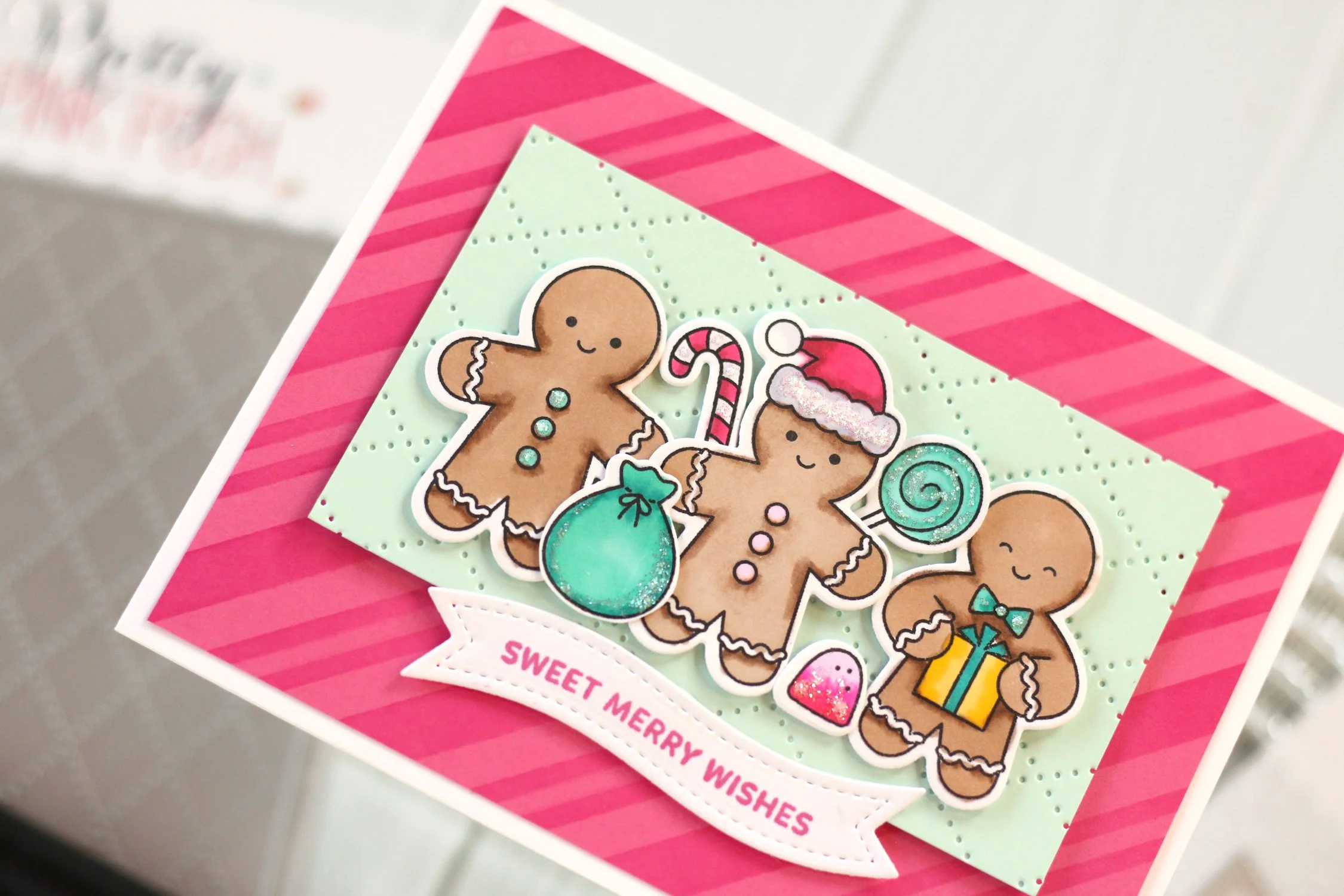 This sweet holiday card design was created with a variety of techniques, but I started off by stamping those sweet gingerbread friends and all of their accessories using the Gingerbread Friends Stamp Set. I die cut the images out using the coordinating Gingerbread Friends Dies, then colored these images with my OLO Markers in happy, candy Christmas colors.