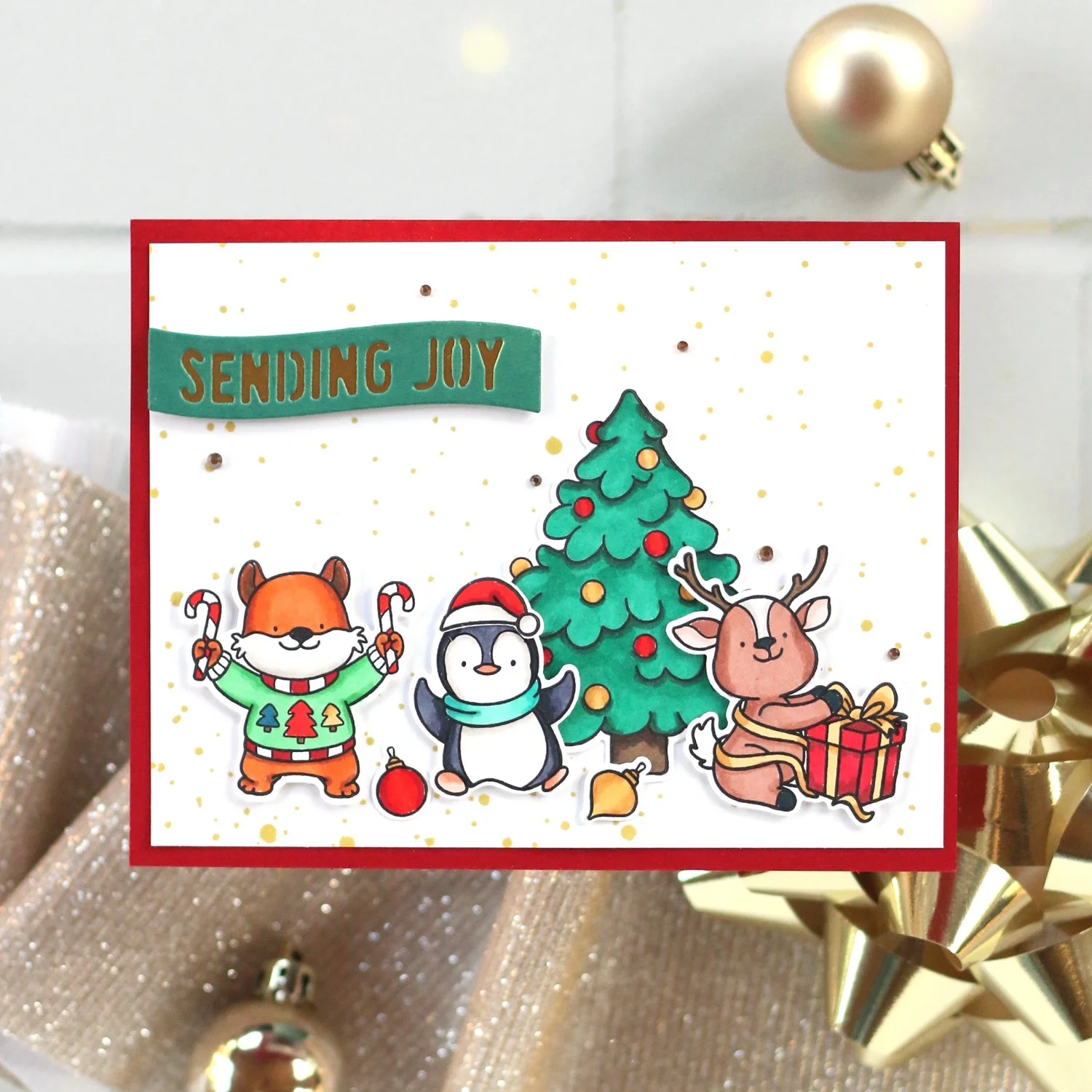 For my final step, I die cut the ‘sending joy’ sentiment from the Christmas Sentiment Strip Dies with the solid piece in Matte Gold Foil paper, and the front in Juniper cardstock. I adhered this to the top left corner of my card front.