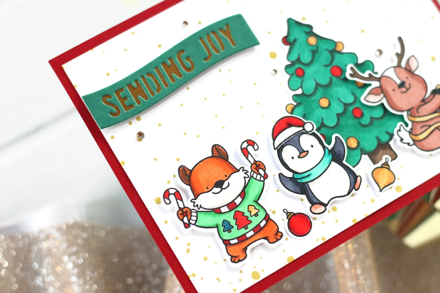 I started creating this sweet card with those cute new critters from the Merriest of Wishes Stamp. I stamped them using Lawn Fawn Jet Black ink, my favorite alcohol-friendly ink. Next, I colored in all of the illustrations using my OLO Markers.