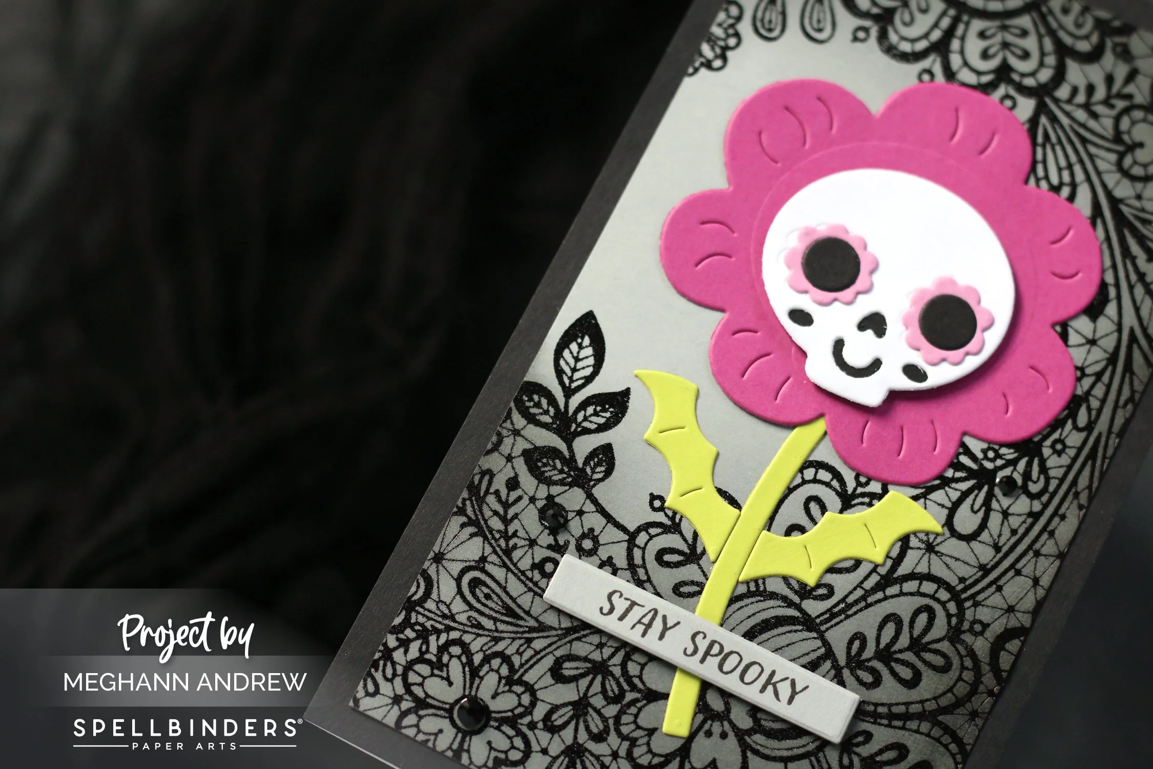 This sweet flower deserved to have a feminine touch on her background, so I used the Friendship Lace BetterPress Plate of the Month and my Glimmer platform to add a black foiled lacey design to gray cardstock. I ink blended black around the outside to make it look a bit more spooky.