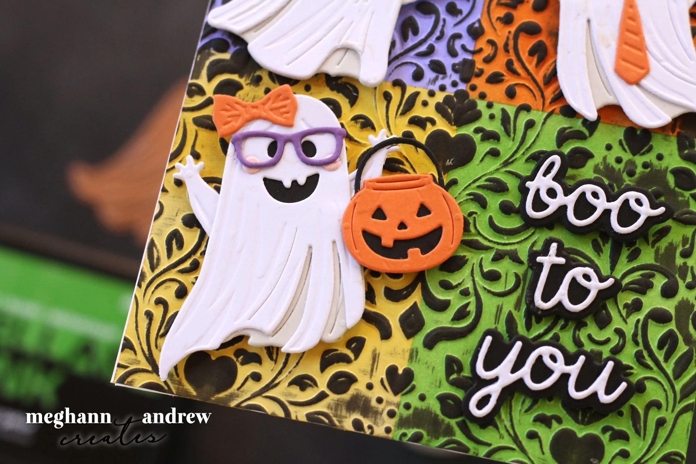 I loved making each one a little different to bring lift to the card. On the fourth quadrant, I added the ‘boo to you’ sentiment cut from the Boo Crew Etched Dies, cutting the shadow layer in black to help it to stand out among the pattern on the background.