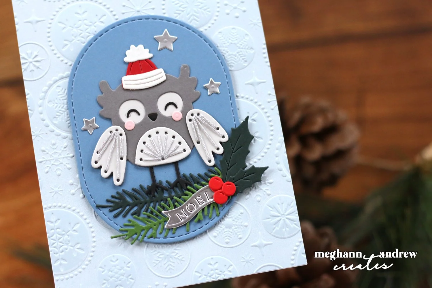 Today’s die set features the sweetest, sleepiest little stitched owl, complete with wing and breast stitching dies, tiny legs, rosy cheeks, a cozy hat with a band and pom pom, and even an eye backer to help bring his expression to life. He’s adorable right out of the package—but even more charming once he’s dressed for winter.