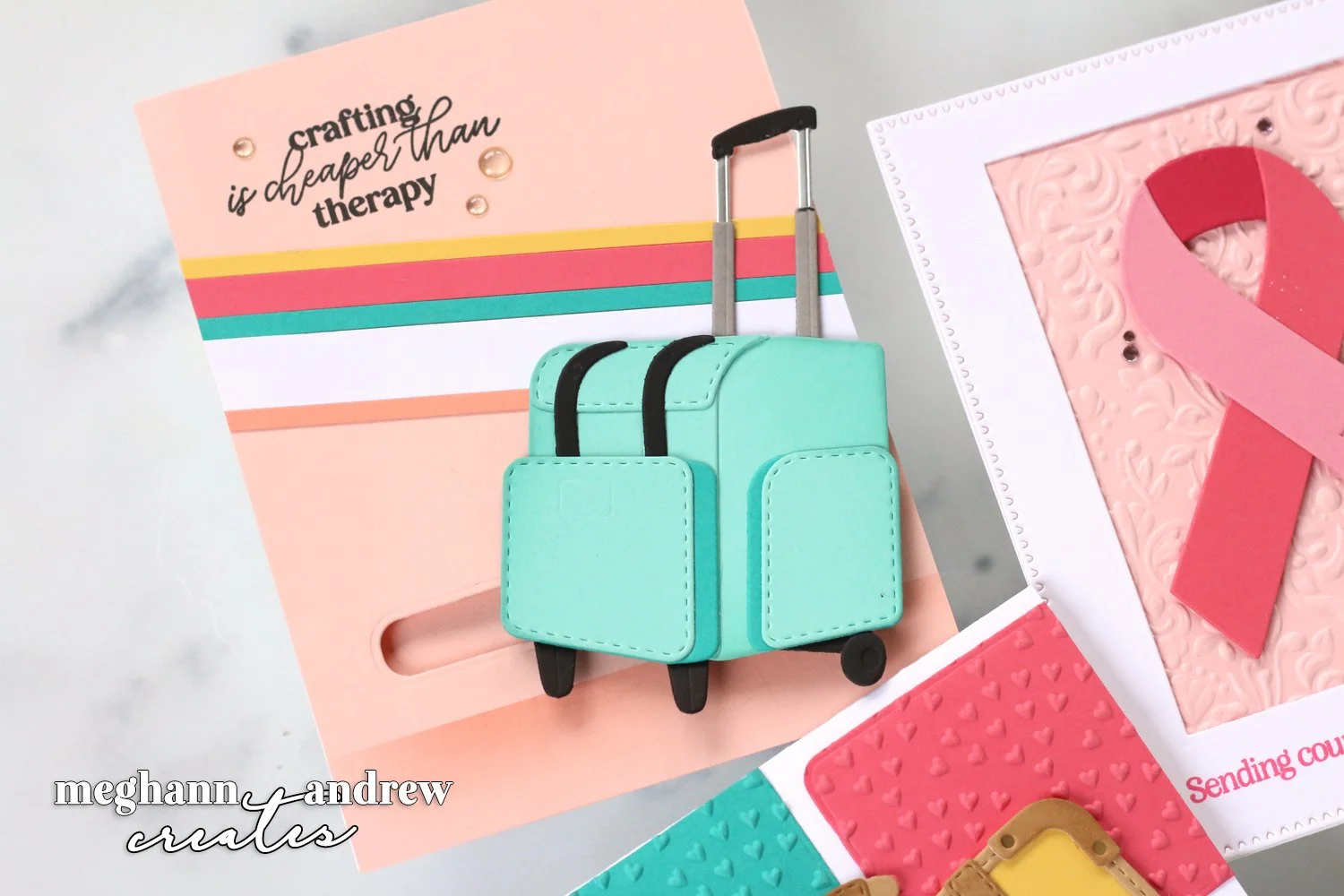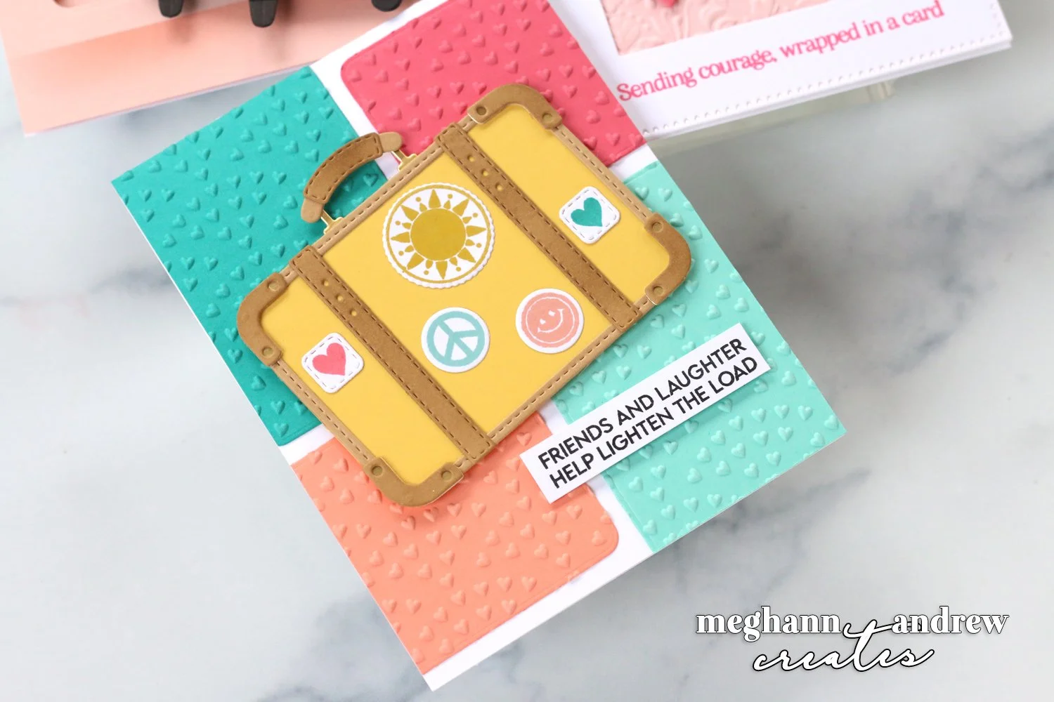The final card I created was SO fun! This iconic Retro Suitcase and Sentiments Stamp & Die Set just needed to be in a bright and happy color, and I kept the same color scheme as on the rolling craft tote card to add the stamped stickers to the suitcase. To use what was in the set, I grabbed the solid suitcase rectangle shape to add colorful rectangles to the background, which I added texture to using a tiny heart 3D embossing folder. The sentiment, also from the Retro Suitcase and Sentiments Stamp & Die Set, seemed like the perfect one to finish off the card.