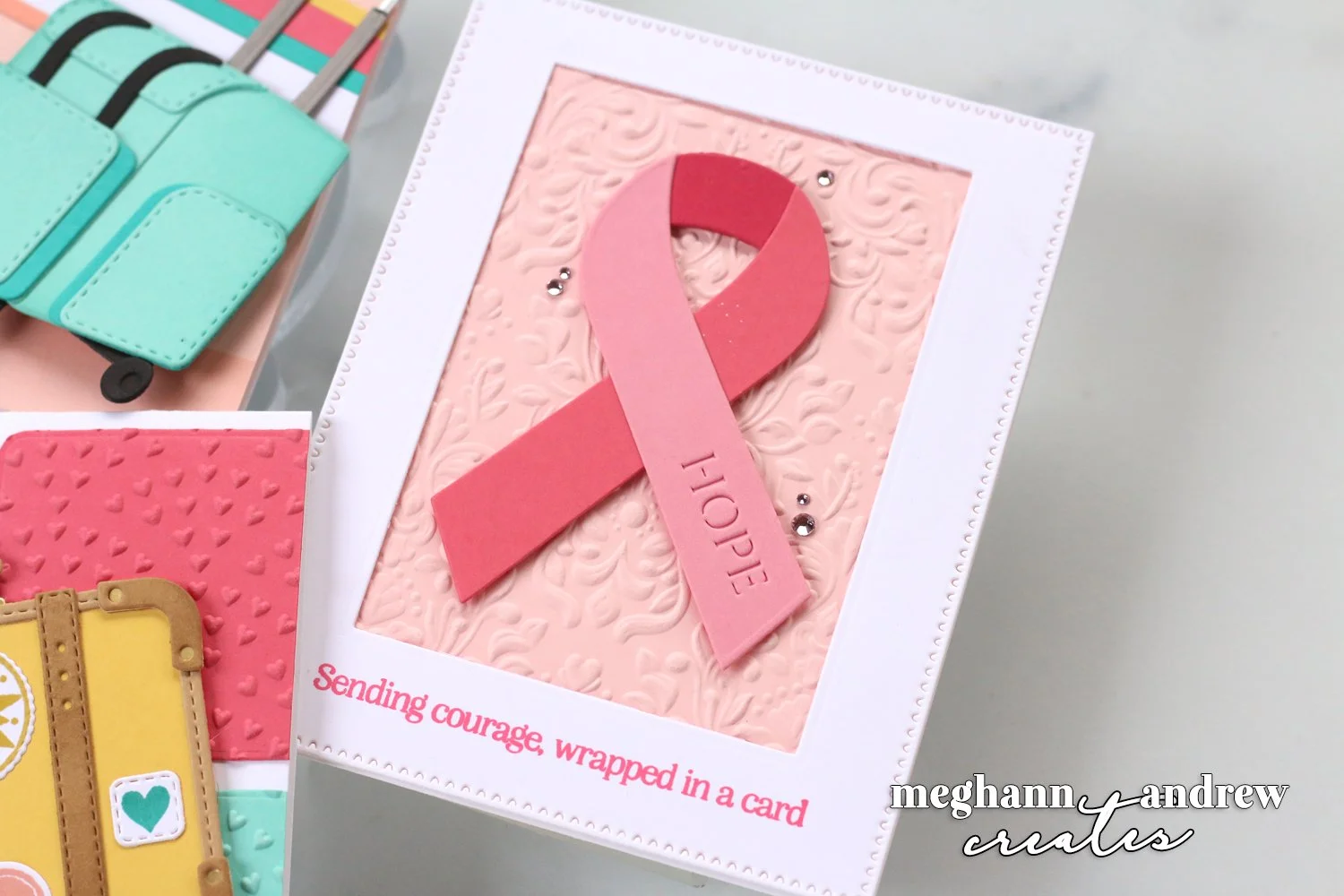 This card is all about showing support for a cancer warrior, and the ribbon die cut from the Awareness Ribbon and Sentiments Stamp & Die Set can be customized in any color for anything that your friend or loved one is going through. I created a frame from white cardstock and the Perfect Touch Rectangles and Tag Etched Dies, then backed it all with light pink cardstock embossed using the Damask 3D Embossing Folder.