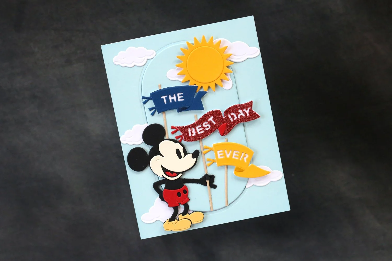 I had to make Mickey hold one of the flags, featuring my sentiment pennants! He was so simple to put together, and I can’t wait to use him to create more cards—hang tight for a holiday card!